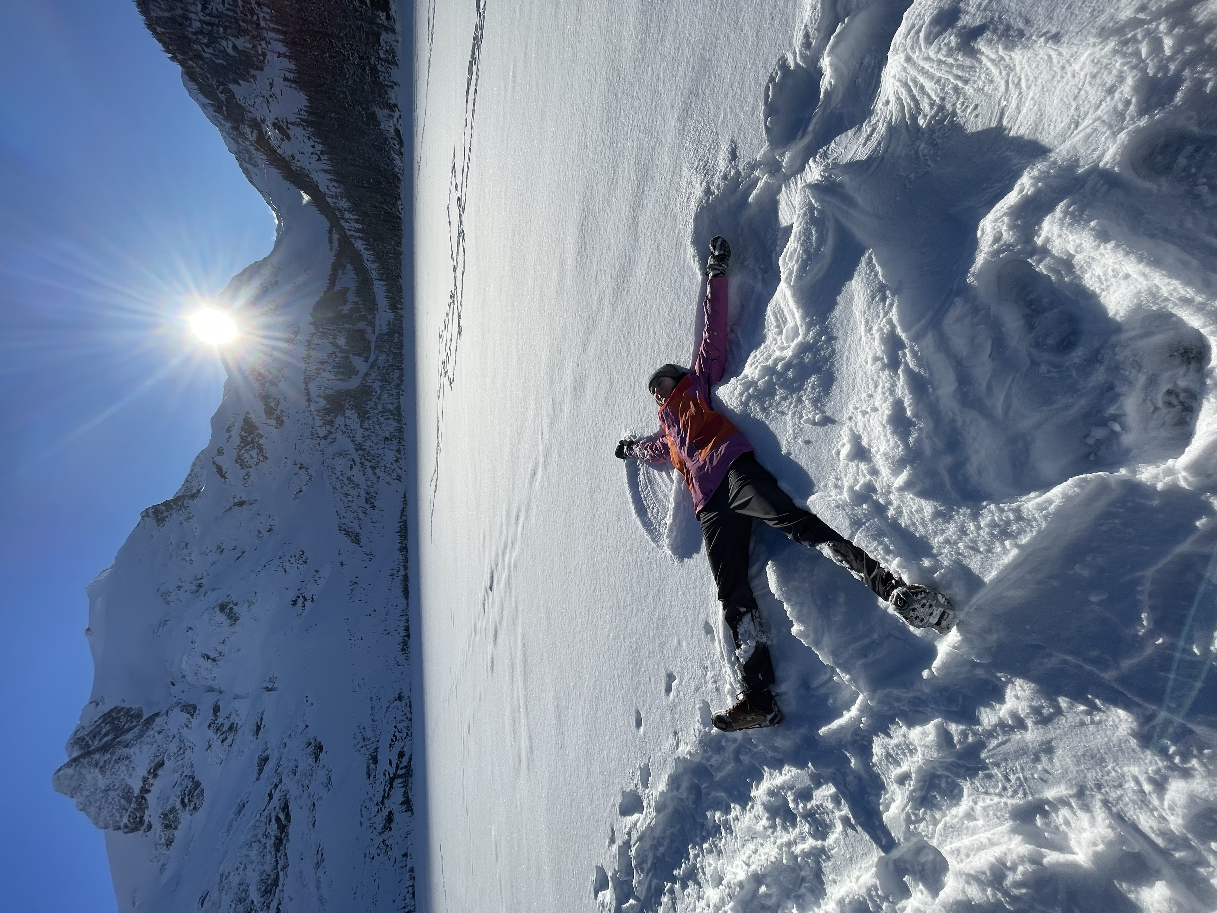 - A woman lying on the snowy ground making a snow angel, with a snowy mountain in the background. See all items with this value