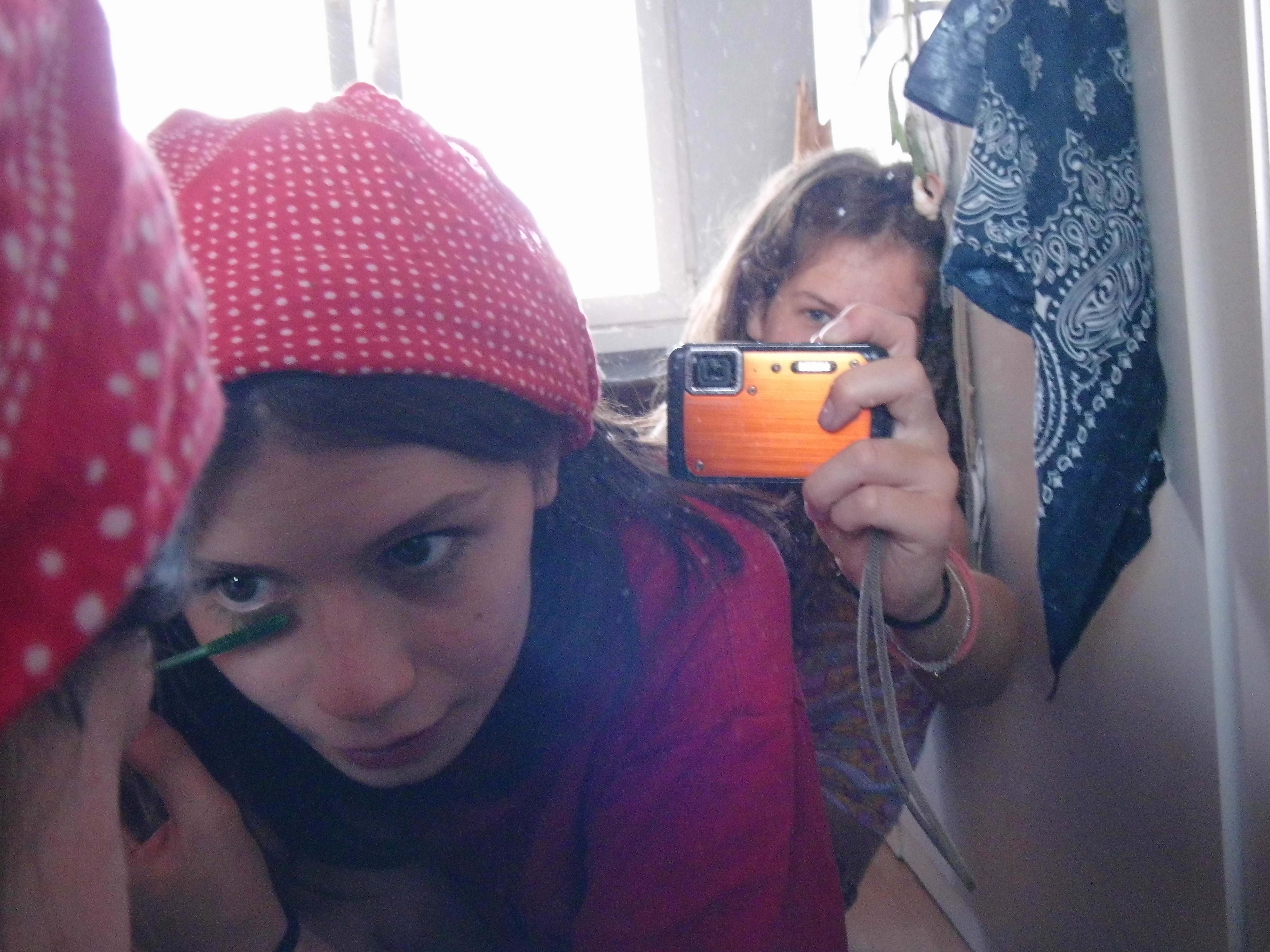 - women in bandana painting lashes and second taking photo in the mirror See all items with this value