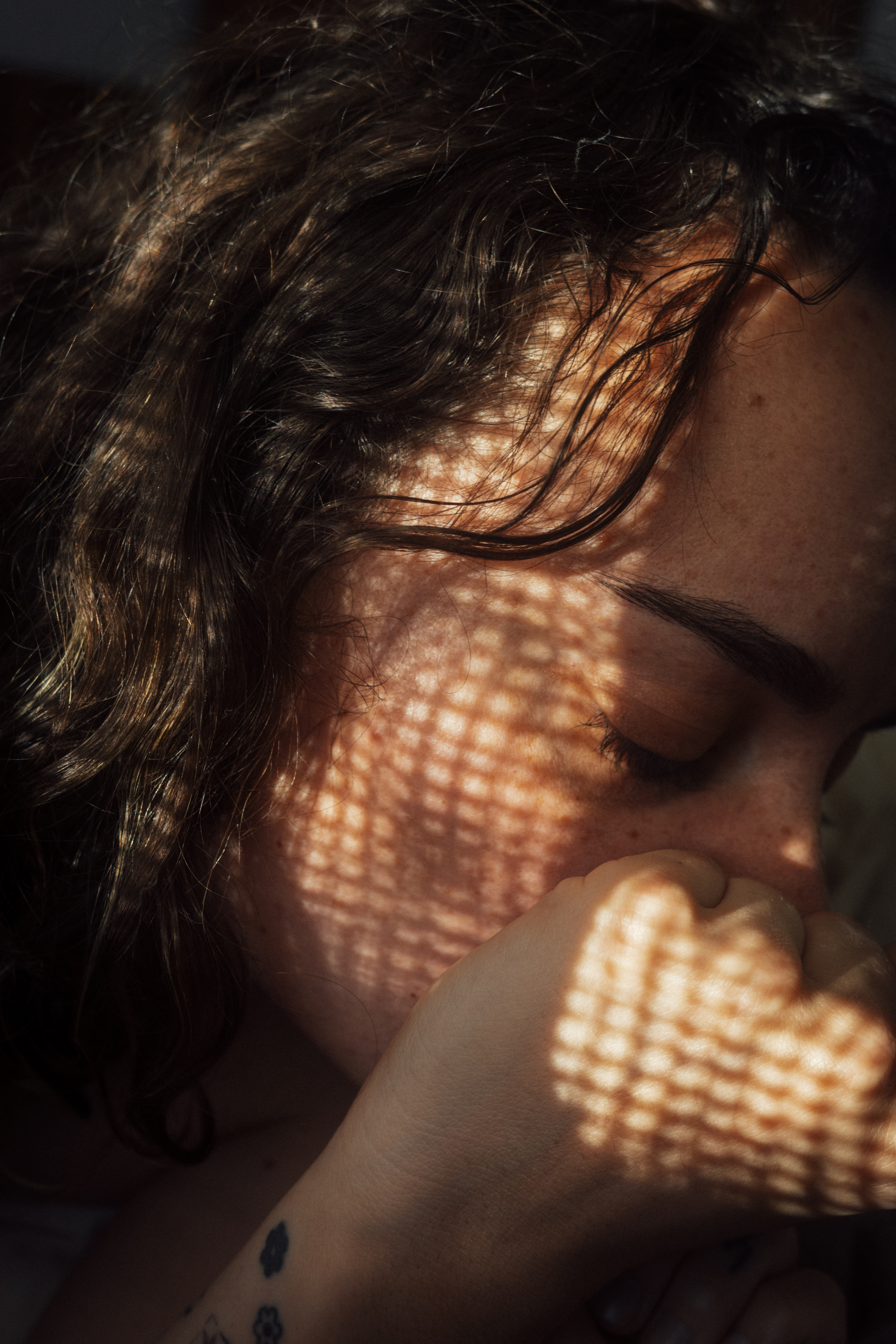 - "close up of brown, curly haired woman facing to her left. her eyes are closed while warm sunlight is reflecting on her face." See all items with this value